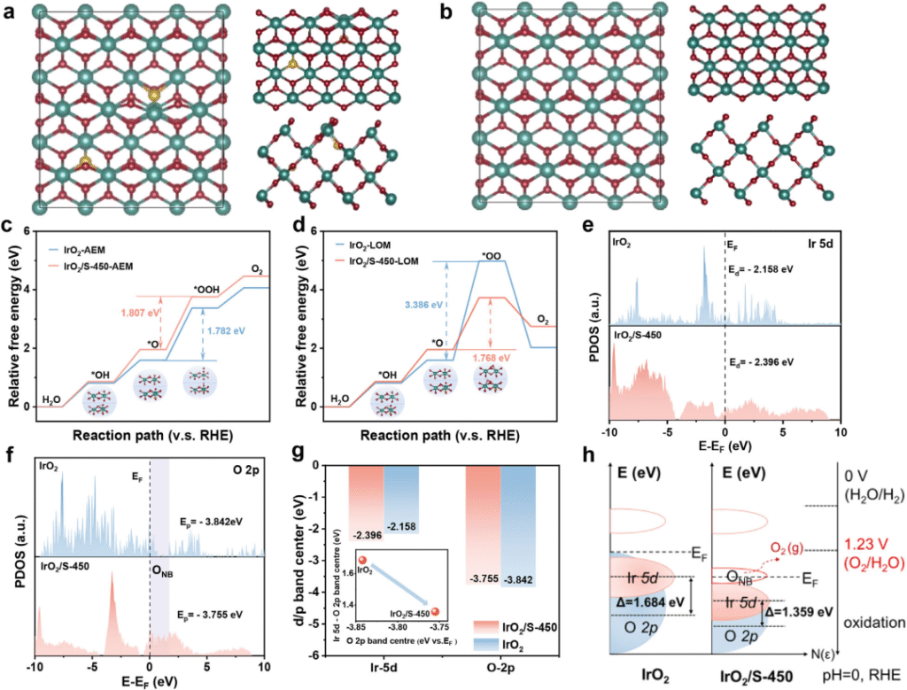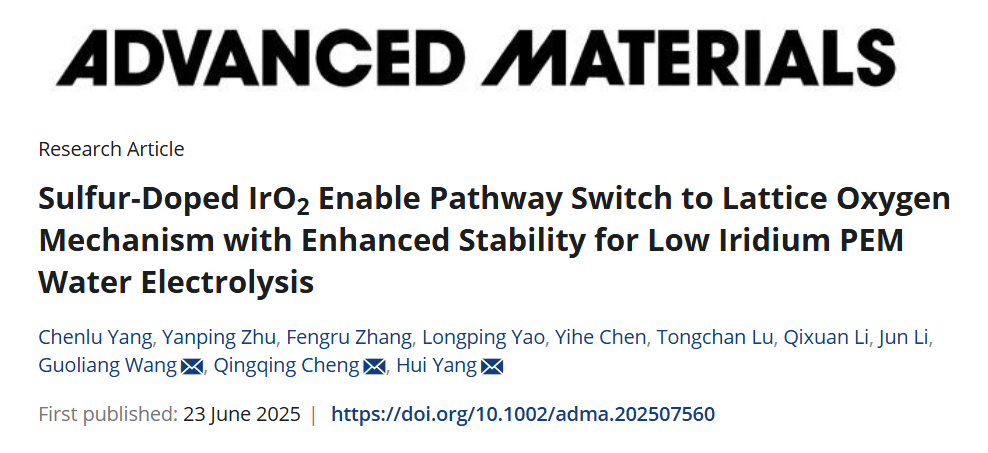 近日,中科院上海高等研究院楊輝研究員團(tuán)隊(duì)與寧波中科科創(chuàng)在質(zhì)子交換膜水電解槽(PEMWE)陽極銥基催化劑研發(fā)領(lǐng)域取得重要進(jìn)展。傳統(tǒng)IrO?催化劑遵循吸附演化機(jī)制(AEM),受限于線性關(guān)系制約,本征活性難以突破。晶格氧機(jī)制(LOM) 通過直接利用晶格氧參與反應(yīng),可打破能壘限制,但會(huì)引發(fā)晶格氧流失導(dǎo)致Ir-O鍵弱化。團(tuán)隊(duì)提出一種硫介導(dǎo)的IrO2催化劑(IrO2/S),使OER途徑從傳統(tǒng)的AEM切換到LOM機(jī)制,同時(shí)IrO2/S中的晶格畸變和不飽和Ir-O配位產(chǎn)生了氧非鍵態(tài),在LOM主導(dǎo)的OER過程中充當(dāng)電子犧牲劑來保存Ir-O鍵。IrO2/S在低Ir用量(0.3 mg cm-2)下展示出優(yōu)異的催化活性(1.769 V, 2.0 A cm-2)與穩(wěn)定性(16.6μV h-1@1.0 A cm – 2)。相關(guān)成果以“Sulfur-Doped IrO2 Enable Pathway Switch to Lattice Oxygen Mechanism with Enhanced Stability for Low Iridium PEM Water Electrolysis”為題,于6月23日發(fā)表在Advanced Materials上。