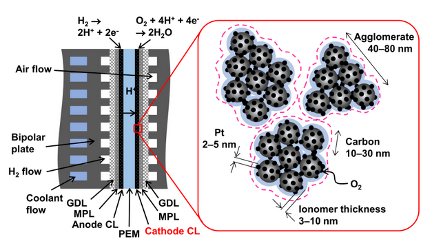 (1)氧氣氣體傳輸受阻??拷呋瘎┍砻娴碾x聚物(例如Nafion)主鏈平行排列,在催化劑周圍形成致密的納米薄膜(<10 nm)。雖然具有較好的質子傳輸能力,但同時增加了氧氣傳輸阻力,因為氧氣需要滲透離聚體覆蓋層才能到達Pt表面(ACS Catal. 2018, 8, 694., Electrochim. Acta 2016, 188, 767)。更糟糕的是,由于覆蓋的離聚物薄膜降低了Pt的活性面積,使得在同等的電流密度(尤其是大電流密度)輸出條件下,單位Pt表面積的電流密度與O2需求量急劇提升。這時催化層中氧氣傳質阻力,特別是局域傳質阻力的限制,就會進一步加劇氧還原反應的傳質極化,大大影響電池性能輸出。